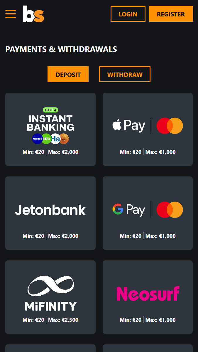 Gör din första insÀttning: NÀr ditt konto har verifierats loggar du in och navigerar till insÀttningsavsnittet. VÀlj önskad betalningsmetod bland de tillgÀngliga alternativen, till exempel Visa, MasterCard, Skrill, Neteller eller andra. Ange insÀttningsbeloppet (minst ⏠25 för att kvalificera dig för vÀlkomstbonusen) och slutför transaktionen.