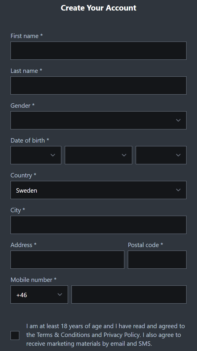 Fyll i din personliga information: Ange din e-postadress, skapa ett starkt lösenord och vÀlj önskad valuta. Fyll i dina personuppgifter, inklusive ditt fullstÀndiga namn, födelsedatum, adress och telefonnummer.