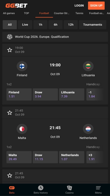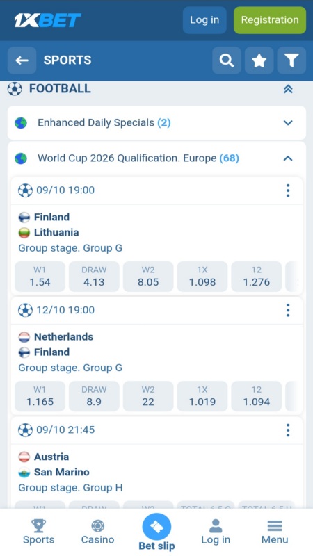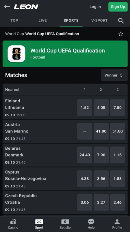 Leon är ett etablerat globalt sportsbook-/casinoföretag som funnits sedan mitten av 2000-talet. Med licens på Kahnawake är Leon inriktat på internationella marknader. Genom appen får du tillgång till betting på VM-kval och futures för FIFA World Cup 2026 och nya VM marknader tillkommer allt eftersom. Leon är känd för ett brett sportutbud, smidig mobilupplevelse och stöd för flera betalmetoder inklusive kryptovalutor.