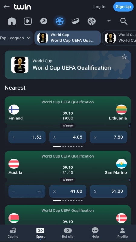 Twin är en relativt ny europeisk speloperatör som profilerar sig som både casino och sportsbook. Appen ger dig tillgång till flera spelmarknader inför fotbolls VM och kvalmatcherna inför huvudturneringen. Twin marknadsförs ofta med fokus på design och dagliga kampanjer. Appen tar lite utrymme och är designad för att fungera även på äldre enheter.